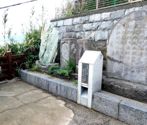『芭蕉の句碑(右から2番目)は、握り飯の半面を押しつぶしたような素朴な碑型の河原石で、「潮墳」の碑と称されて観光客に親しまれています。青緑の色濃い自然石を程よく活用して「疑ふな潮の花も浦の春はせを」と彫りこまれたこの句は二見ヶ浦(三重県)での作ですが、ここの自然環境に溶け合っています。佐羽淡斉の詩碑(右から3番目)は、野火で碑面が剥落していたのを、4代目の子孫が再建したものです。淡斉は、上州桐生の人で、大窪詩佛門下の詩人です。全国の名所旧跡を遍歴して百詩碑建立を図り、江ノ島の碑はその第1号として建てられました。服部南郭(右から4番目)の詩碑は、島内で一番古い詩碑で、高さ95㎝、幅35㎝表に七言詩、背面に文化2年(1805年)これを建立したと識語されてあります。南郭は、京都に生まれ、江戸に出て、儒学者荻生徂徠の門に学び、後に柳沢吉保に仕え、詩文をもって知られた人です。江の島には幾度も来遊し、そのたびごとに、江の島にちなんだ詩をのこしましたが、この詩は南郭の快心の作といわれています。』