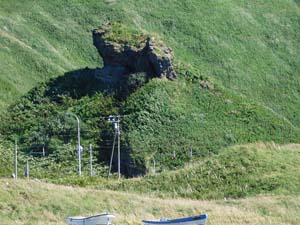 抜海漁港に入る手前の路上から右側の丘の途中にある小山の上に大きな岩がポッカリと載った光景が目に入ってきます。